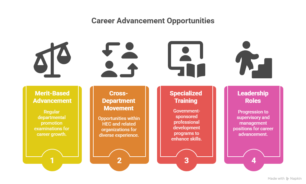 • Merit-Based Advancement: Regular departmental promotion examinations
